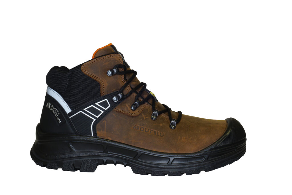 Atmungsaktives und wasserabweisendes vollnarbes Nubuk Leder. Abriebfester Vorderkappe. Abrieb- und reißfestes HiTech-Gewebe, im hinteren Bereich gepolstert für mehr Komfort. SAFETY STRUCTURE, externe Verstärkung im Fersenbereich für mehr Stabilität der Körperhaltung und Schutz mit Reflexstreifen für hohe Sichtbarkeit