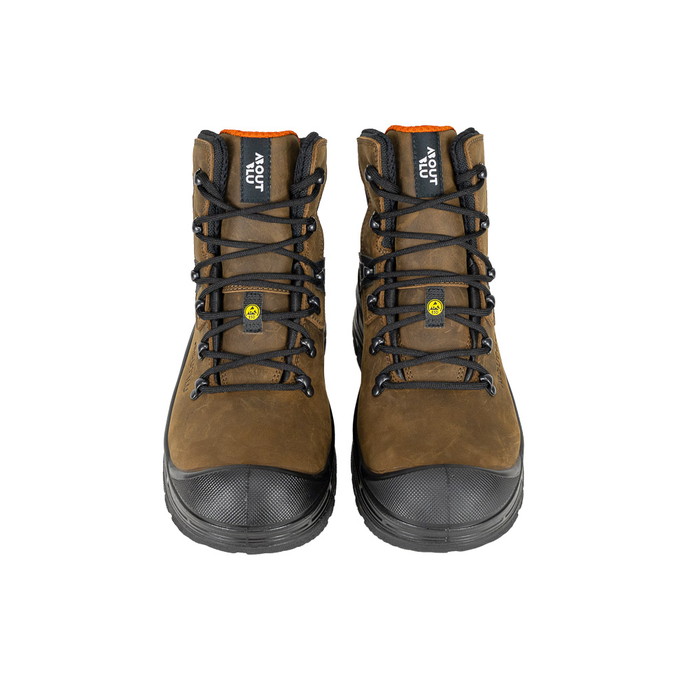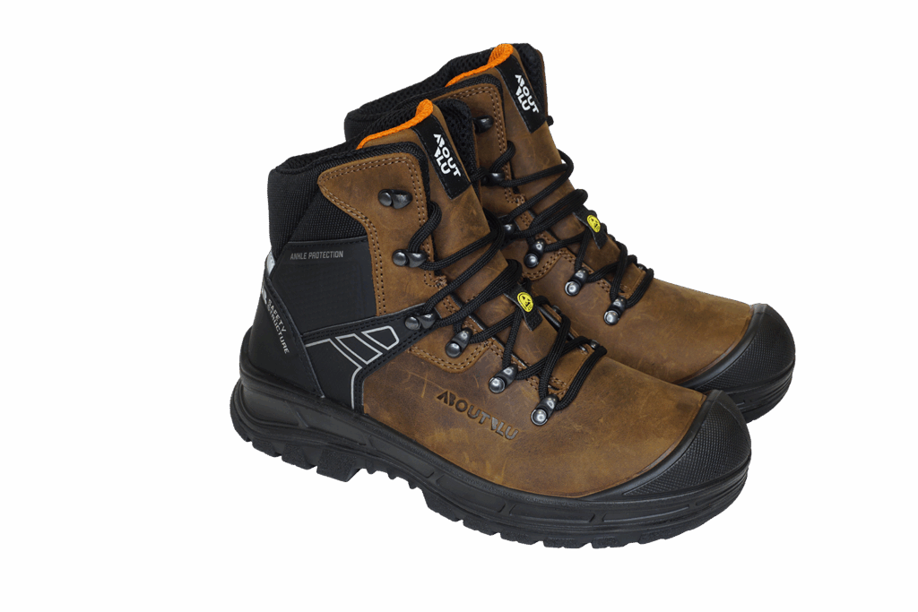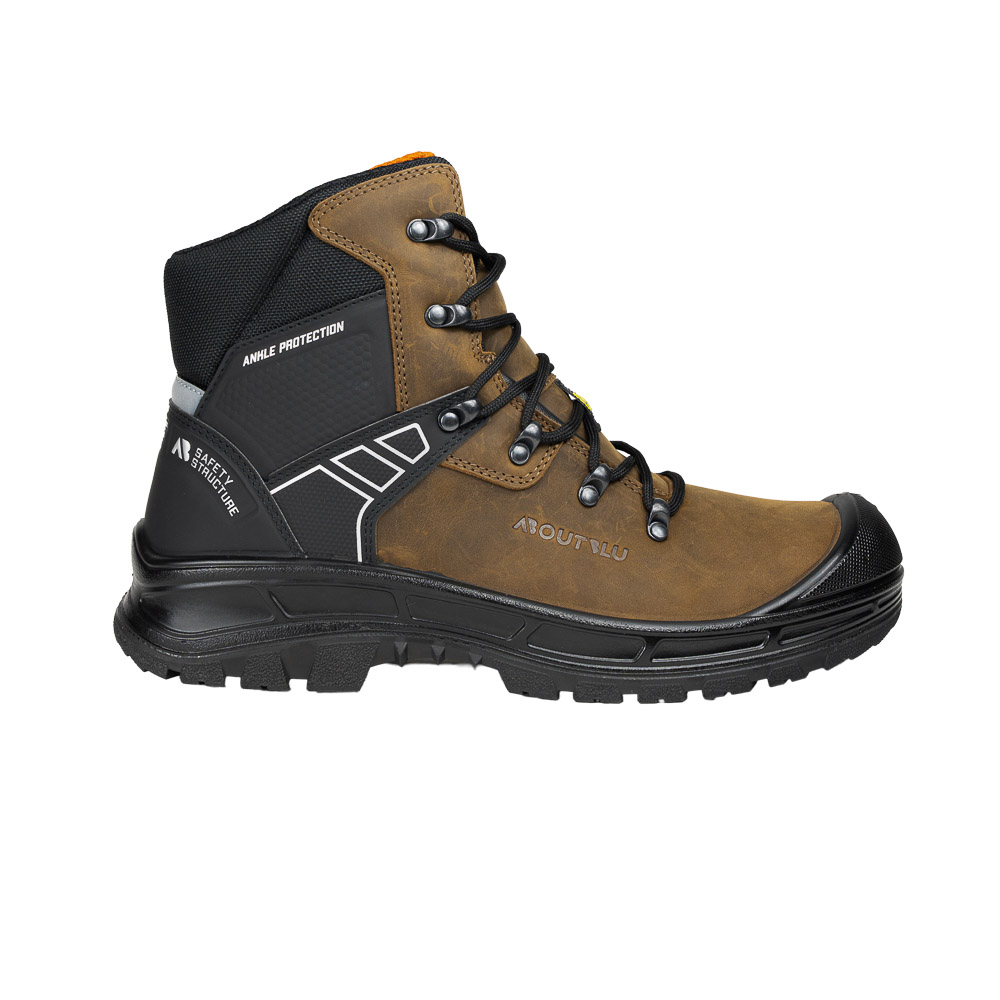 Water repellent and breathable Nubuck grain leather with scuff-cap. HI-Tech fabric. SAFETY STRUCTURE, external reinforcement on the back heel. AN certification for the ANKLE bone protection.